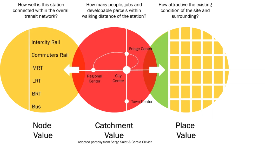 Node Value节点值:通过线路收敛、服务频率、乘客数量和网络连接来衡量空间站在区域交通网络中的中心位置。高节点价值需要先进的交通基础设施,包括多个出口、公交站和自行车设施。东京站将最大节点价值作为日本首屈一指的铁路枢纽,整合了高速铁路、区域服务和城市地铁系统。在胡志明市,邱井天站通过将东方公交站与地铁延伸连接至平东奈,实现了显著的节点价值。