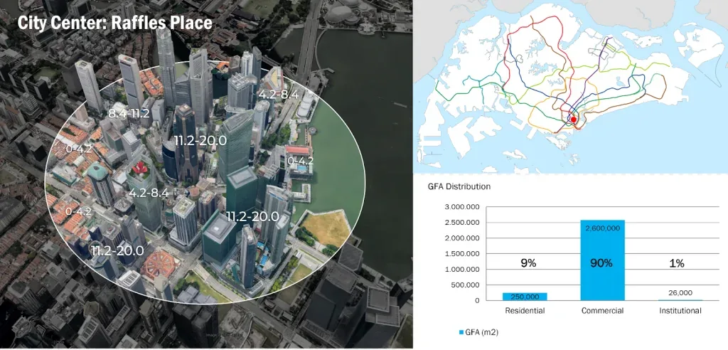 City Centers:城市中心:拥有卓越节点、集水区和位置值的车站,通常位于已建立的中央商务区。这些交通超级枢纽可容纳两到三条交叉线路,可能包括城际铁路连接。地块面积分配非常有利于商业用途(80%至90%),住宅和市政部分有限。莱佛士广场站将这一类型学概括为新加坡基础东-西线和南北轨道交通线路的交汇点,服务于商业用途占近层区域90%的金融区核心区域。胡志明市的本·谭和图提姆站是这一类型学的新兴范例。