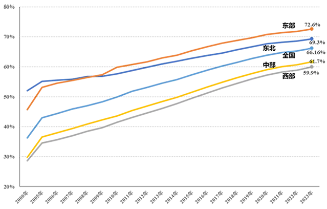 我国各区域处于不同的发展阶段,自然禀赋、产业基础和人文地理环境差异较大,2023年,东部、中部、西部、东北地区城镇化率分别为72.6%、61.7%、59.9%、69.3%,近十年分别提升9.7个、13.3个、13.8个、8.4个百分点(图1)。其中,京津冀协同发展、长三角一体化、粤港澳大湾区三大区域重大战略地区承担着区域经济社会发展的示范引领和辐射带动作用,2023年城镇化率分别为70.6%、72.8%、87.5%(珠三角九市),高于全国平均水平,未来将继续提升至80%以上。