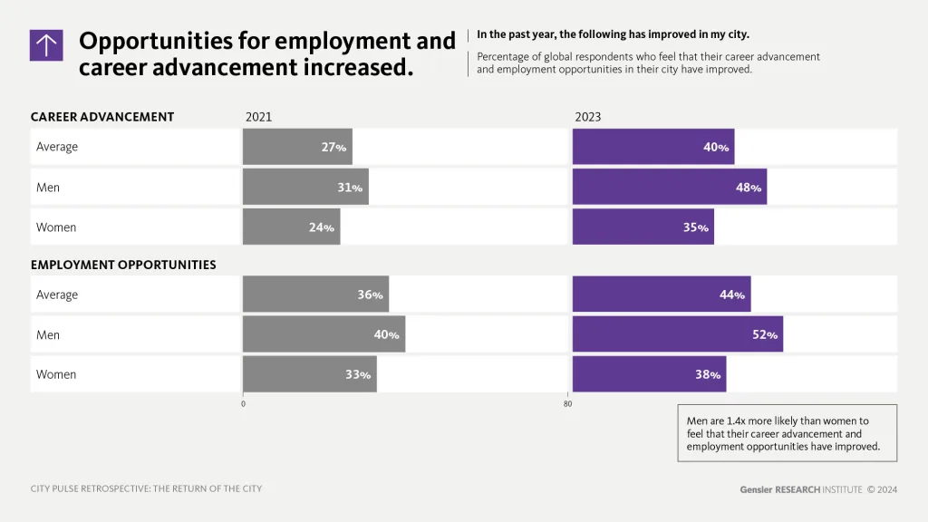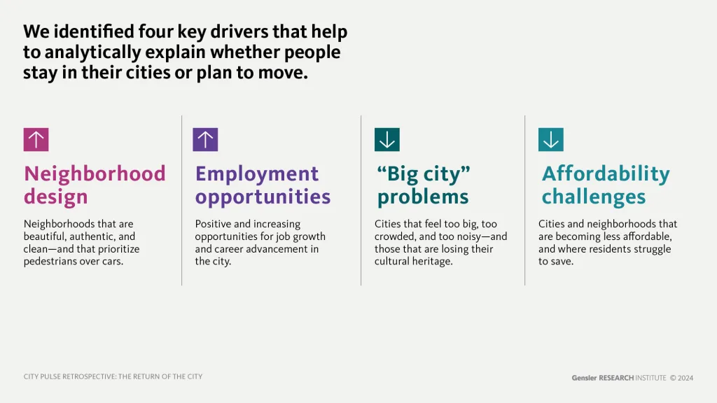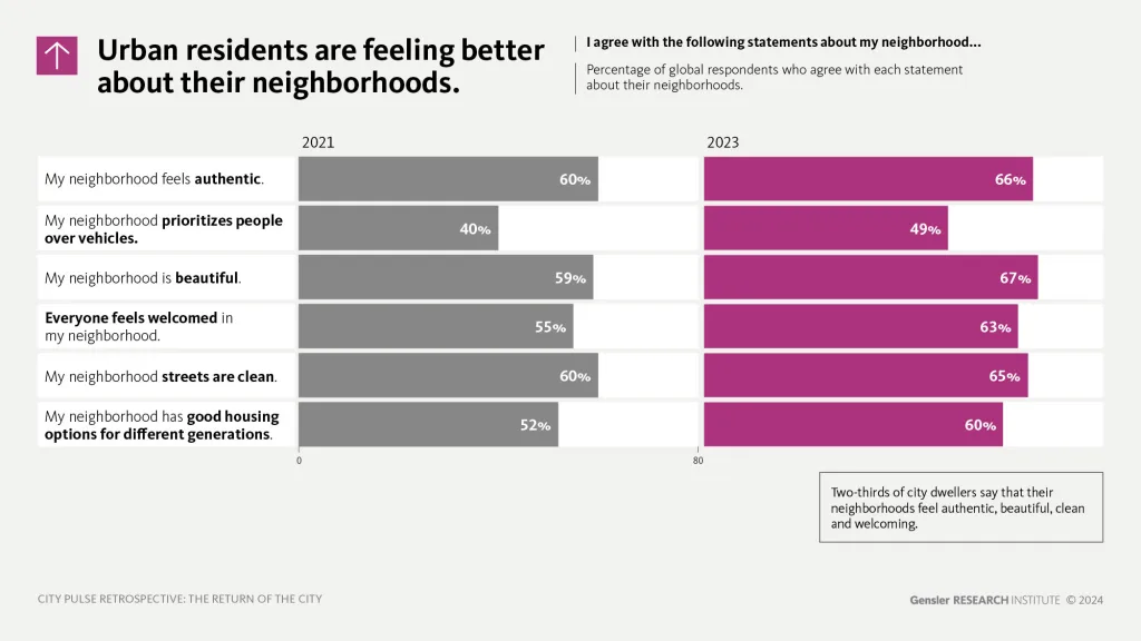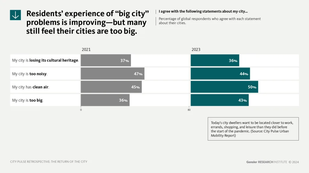 2020年,全球疫情暴发后的前几周,杰恩勒建筑设计事务所(Gensler)发布了首份《城市脉动》调研。2021年,我们继续推进这项研究,彼时世界各地的媒体都在宣扬“城市消亡论”,而我们试图探寻城市的存续之道。在最新发布的《城市的回归:2024年〈城市脉动〉调研回顾》报告中,我们梳理了历年研究成果,展现了2021年至2023年最新数据采集阶段,全球15座城市的民众对城市的认知变化。调研数据揭示出一个共同主题:城市生活虽存在诸多痛点,但城市的吸引力始终经久不衰。