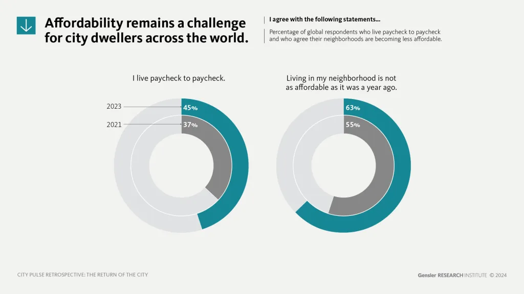 全球经济波动不定,城市居民也纷纷表示正面临个人财务困境。疫情不仅扰乱了诸多行业的生产与流通环节,极端天气、俄乌冲突、巴以冲突等因素,也推动全球多种大宗商品价格攀升至历史高位附近。本次调研中,近半数(45%)的全球受访者表示自己靠薪水度日、入不敷出,另有63%的受访者认为,所在社区的宜居成本较一年前有所上升。