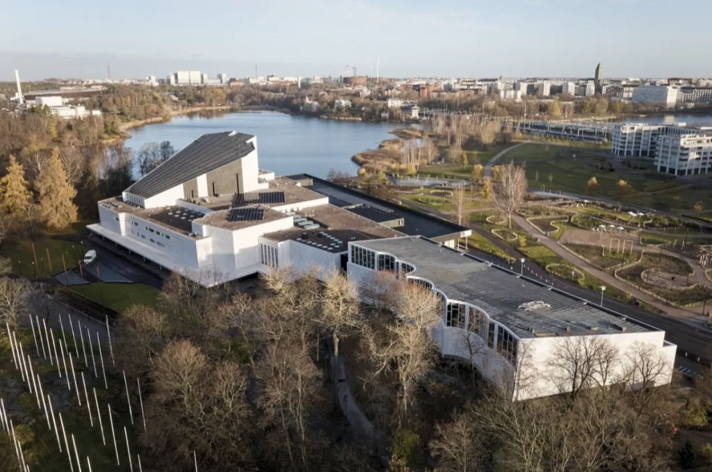 公共建筑方面,策展人Timo Riekko提到自己尤其倾心「芬兰厅(Finlandia Hall)」的设计。芬兰厅是赫尔辛基标誌性的音乐表演场地,1971年落成,是Alvar生涯晚期的重要代表作。Timo提到,建筑部分外牆呈现不规则波浪形,并非单纯的造型设计,而是Alvar当初不想砍伐基地旁的树木,而让建筑边缘绕着树木建造。时隔数十年,有些树木终究因年老而必须被砍伐,但Alvar当时尊重自然的精神仍留存至今,那片弯折的牆面就是隽永的印证。