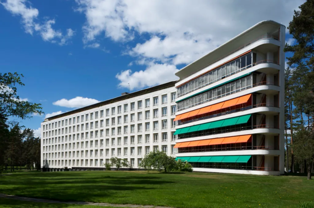 位于芬兰西南部一片松树林中的「帕伊米奥疗养院(Paimio Sanatorium)」,以有别于塞于奈察洛市政厅的手法体现建筑「人性」,其整体设计从结核病患者角度出发,从照明、声音、家具、室内设计,到对空气品质的管控,全面打造能促进患者身心復原的疗癒建筑。