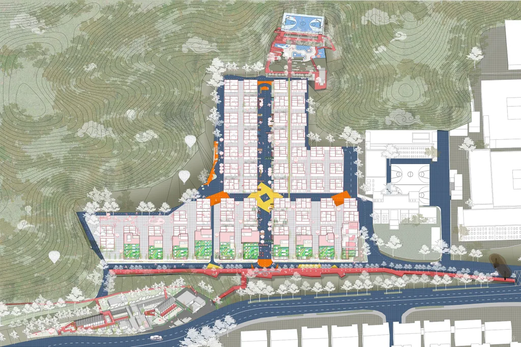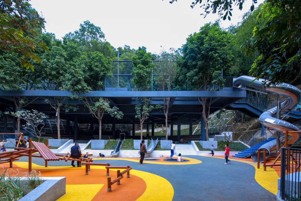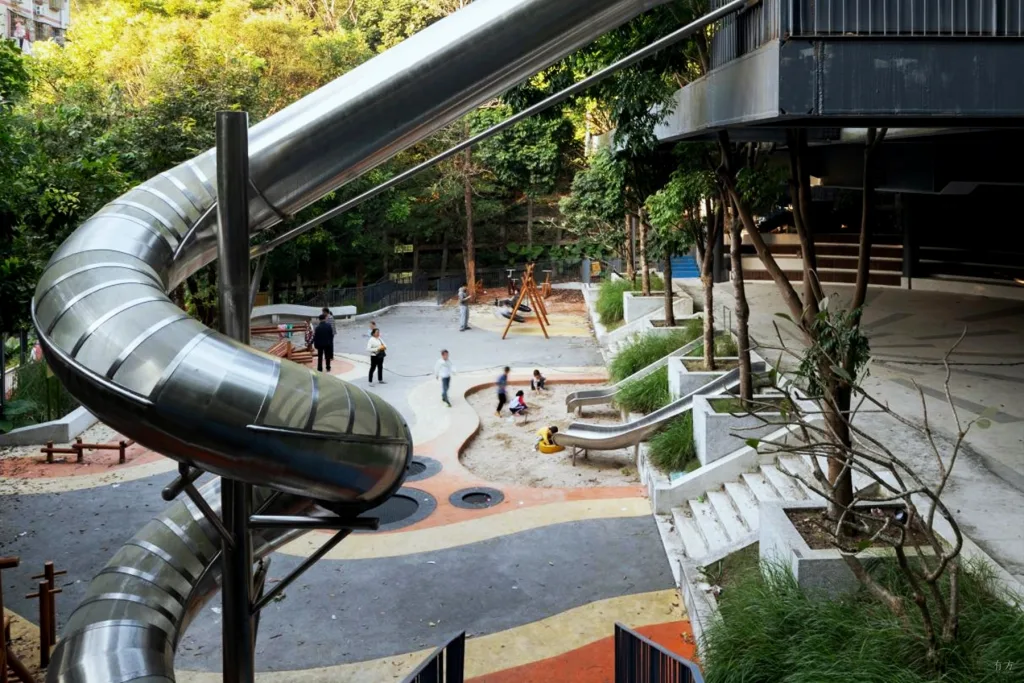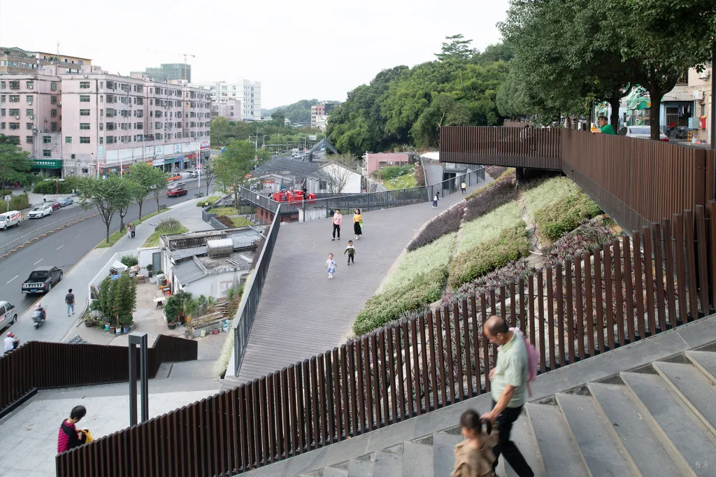 这一系列标准化的建设模式,最终让凉帽村完全融入了中国城市化的快速发展进程中,被周边工业厂房所包围,失去了原有的独特性,成为典型的“千村一面”城中村的一员。村址公园与社区乐园这两个基础设施组团顺应现状地形和自然条件,缝合不同时期的发展痕迹在物理空间上造成凉帽村各方面的“割裂”,建立起快慢交互、公私交互、新旧交互、城市与自然交互多元体验,提升村落公共生活的活力。