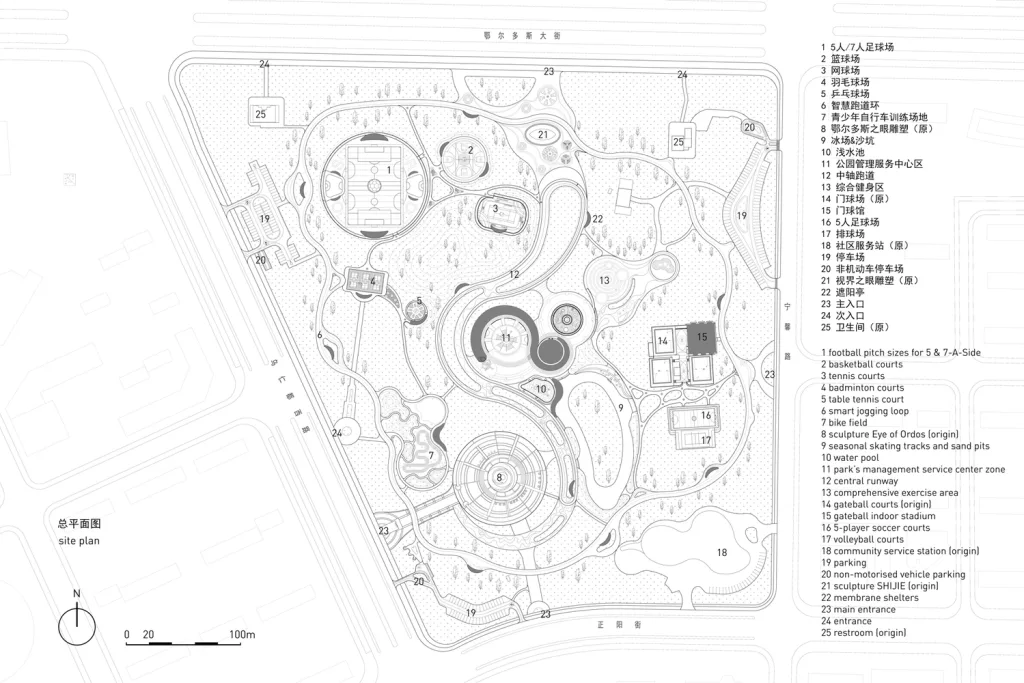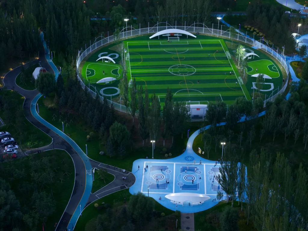 鄂尔多斯康巴什区运动公园,现已升级改造为鄂尔多斯智慧体育公园,是一个集智慧设施、全龄友好、地方特色(借鉴沙漠、草原地景肌理)于一体的综合性城市体育公园,于2023年8月正式开放,提供智慧照明、智慧跑道、智慧导览、太阳能充电等服务,深受市民喜爱