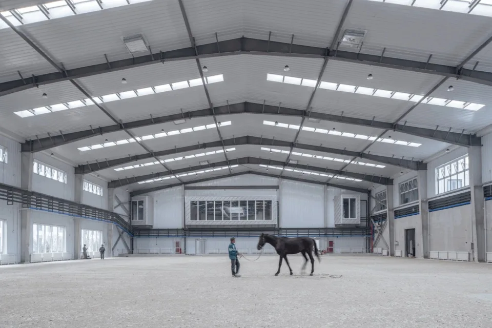越美术馆与悦马术馆位于烟台城市科技职业学院校内,建筑面积约4500平方米。该建筑是由马术馆与美术馆共同组成的一个功能复合体建筑。马术馆是一座依照国际马联标准设计的现代化室内马术场馆。场馆配备恒温新风系统与无影照明矩阵等现代化设施。马术馆的功能包括:室内马术场地、马厩、办公室、接待室等。
